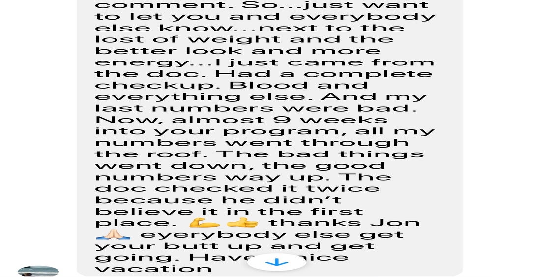 Bedankt Jon voor je hulp. Ik heb een nieuwe manier van gezond leven geleerd als gevolg hiervan en ik zal doorgaan met het maken van vooruitgang en verliezen.